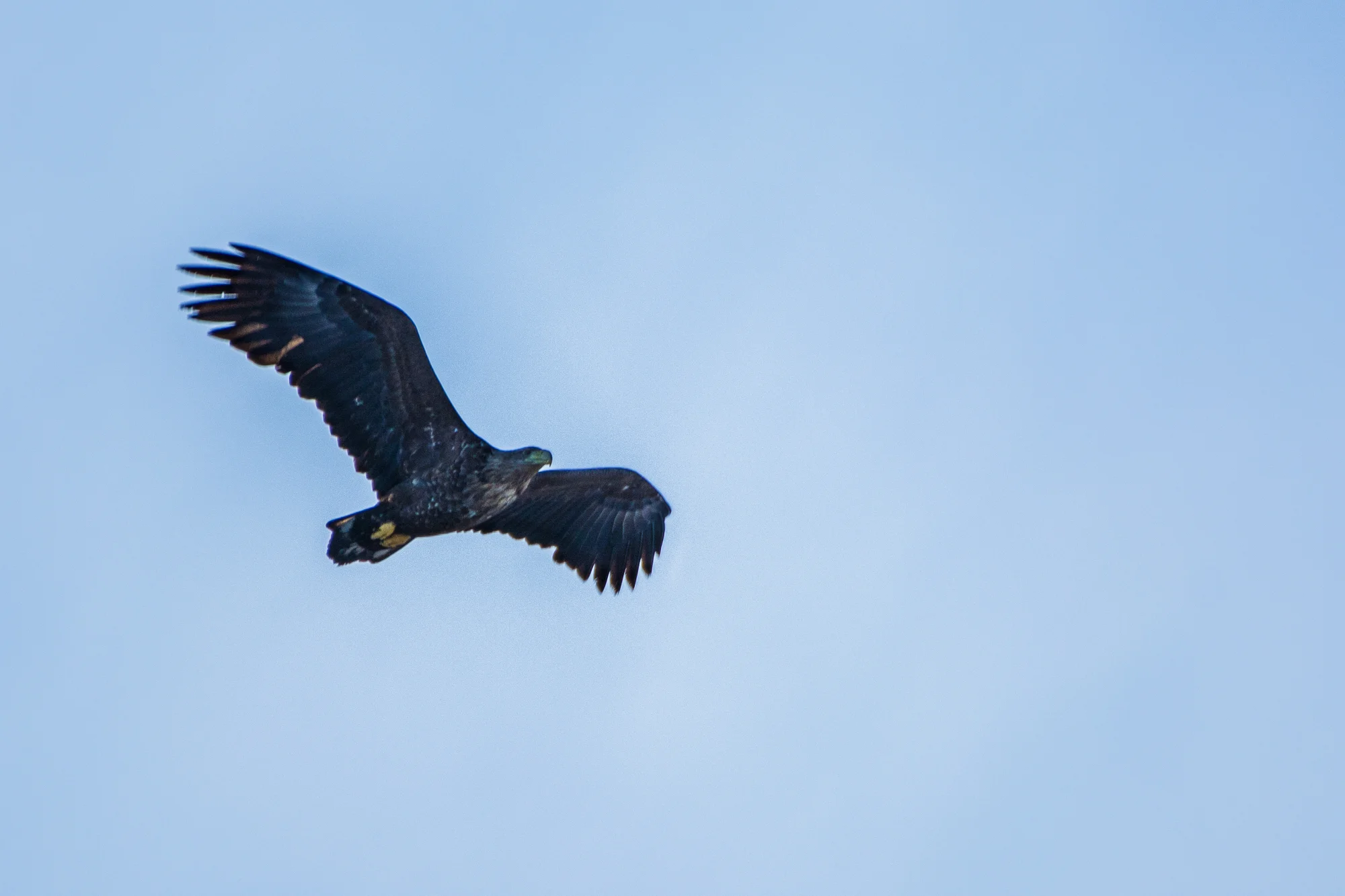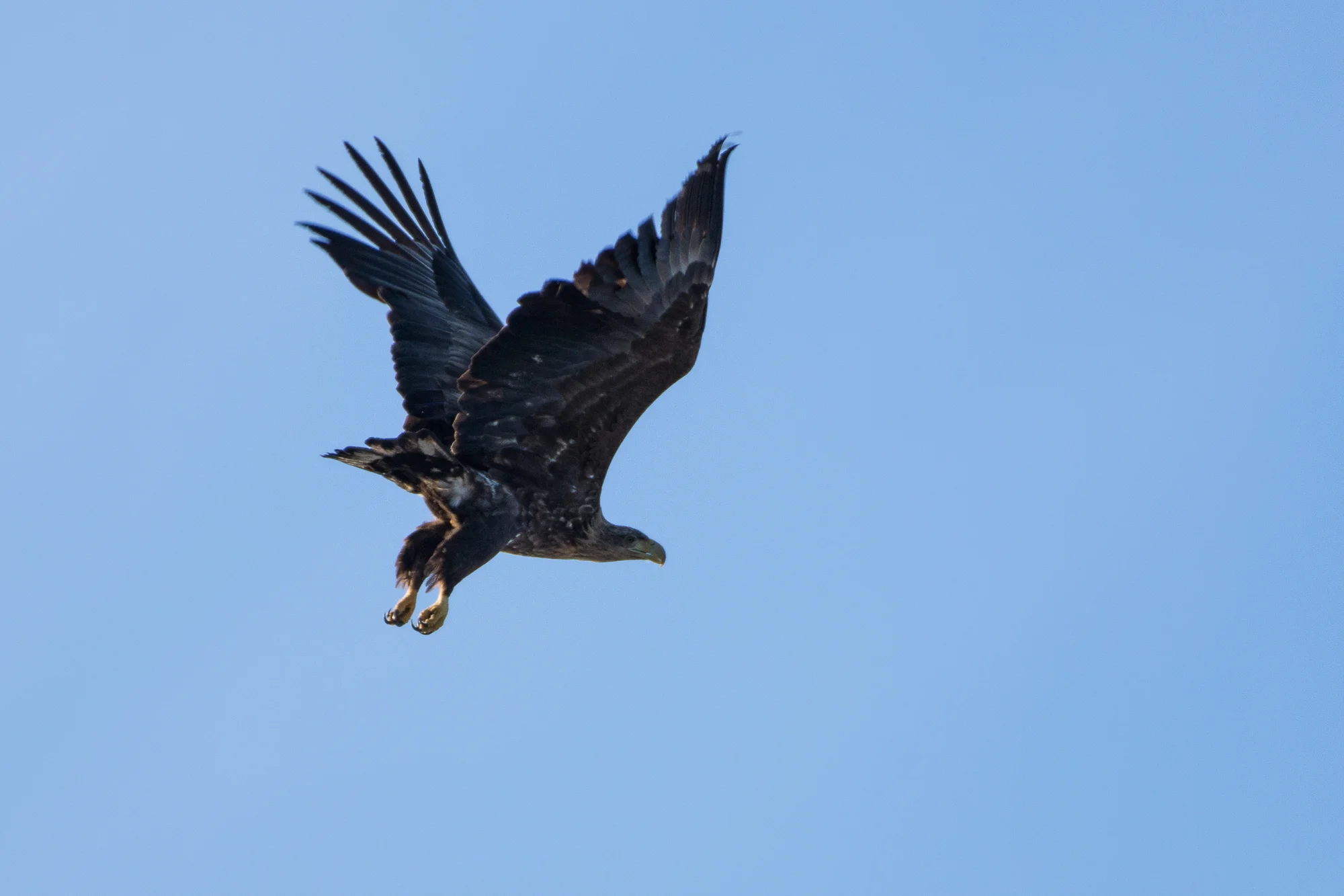 After waking up at 7am, I was walking on the beach, tracking the various birds in the area (crows, swans, ducks, tits and a pair of Greenfinch). I was looking mainly north, where most of the bigger birds were coming from. For some reason, I decided to turn and look south instead, and there it was. Not even 50 meters away, coming in low over the beach, was the eagle. I didn't even think, I just lifted my camera and started snapping. Unfortunately I had my setting slightly wrong because I had been photographing the finch, but I still got about 20 shots when the eagle slowly flew over me.