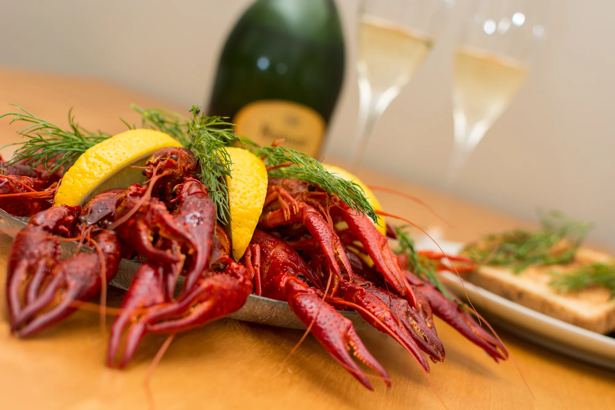 First, the background isn't the best, but since that's how my kitchen wall looks, so be it. The main goal is that it isn't distracting. The second thing is the use of a shallow depth of field. This photo was taken with a 35mm lens at f4, focusing quite close (about 40 cm from the sensor), resulting in the nice blur effect you see. In this photo, all the crayfish don't need to be in focus for you to know what they are. Similarly for the bottle, champagne glasses, and the toast. The shape and colour allows your brain to make the connection, especially if you've ever tasted the combo previously.